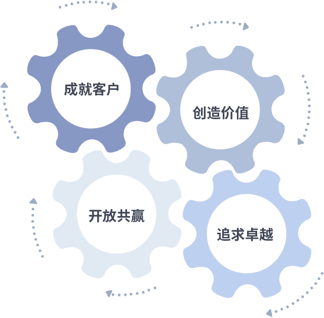 成就客户是一切决策的出发点,,,创造价值是衡量所有工作的标准,,,追求卓越是我们做事做人的态度,,开放共赢是我们的格局也是最终的结果。。价值观的齿轮环环相扣,,,推动着组织里的每个人不断向前。。。。